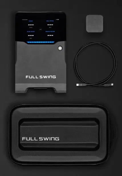 No extra accessories fees here, it’s all included: Full Swing KIT Launch Monitor, Charging Block, USB-C Charging Cable, Protective Travel Case