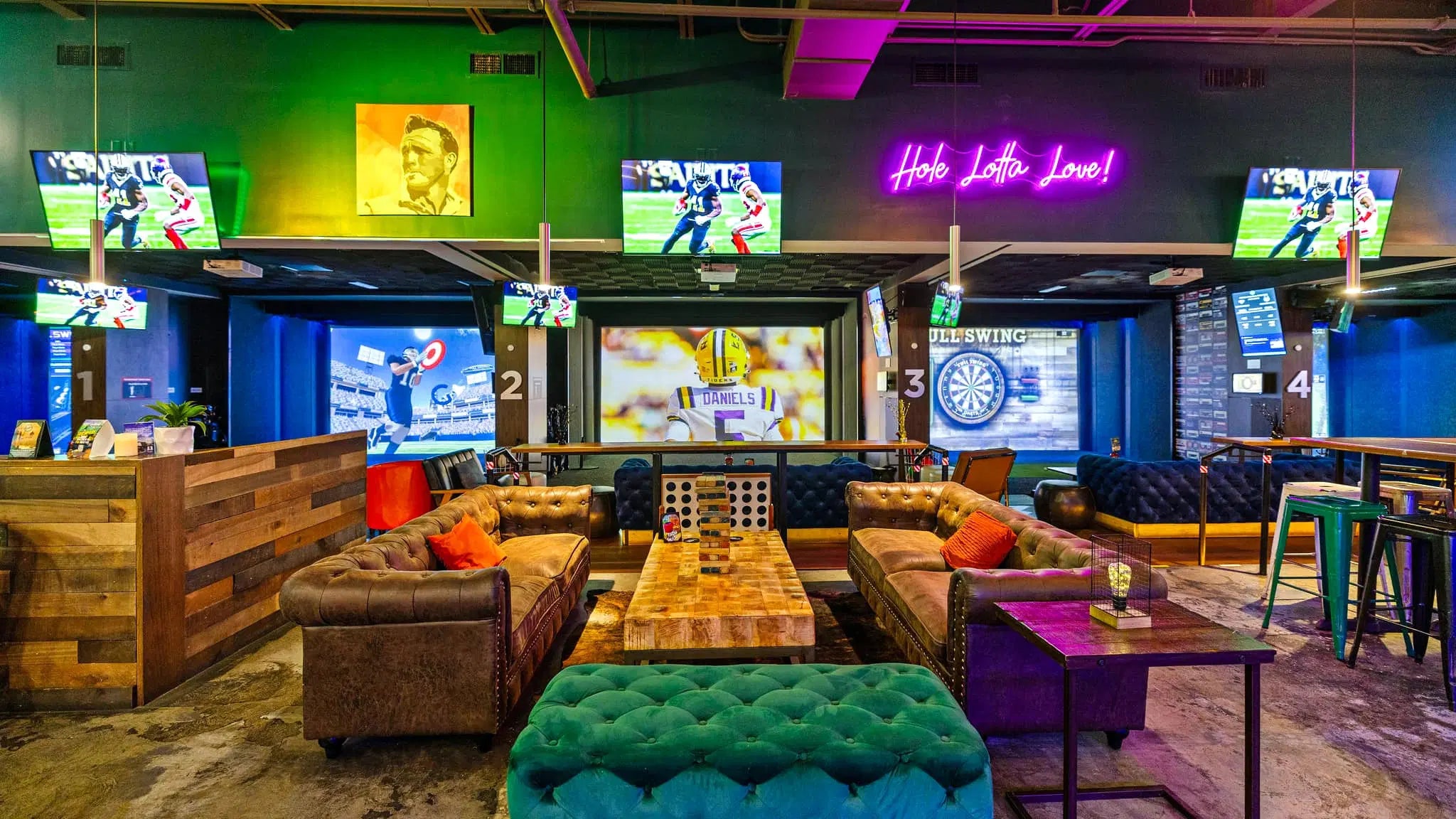 Aside from our 30 gaming experiences beyond Full Swing Golf from zombie dodgeball to football, there is always the option to use as your new theatre to be rented out for game watches.